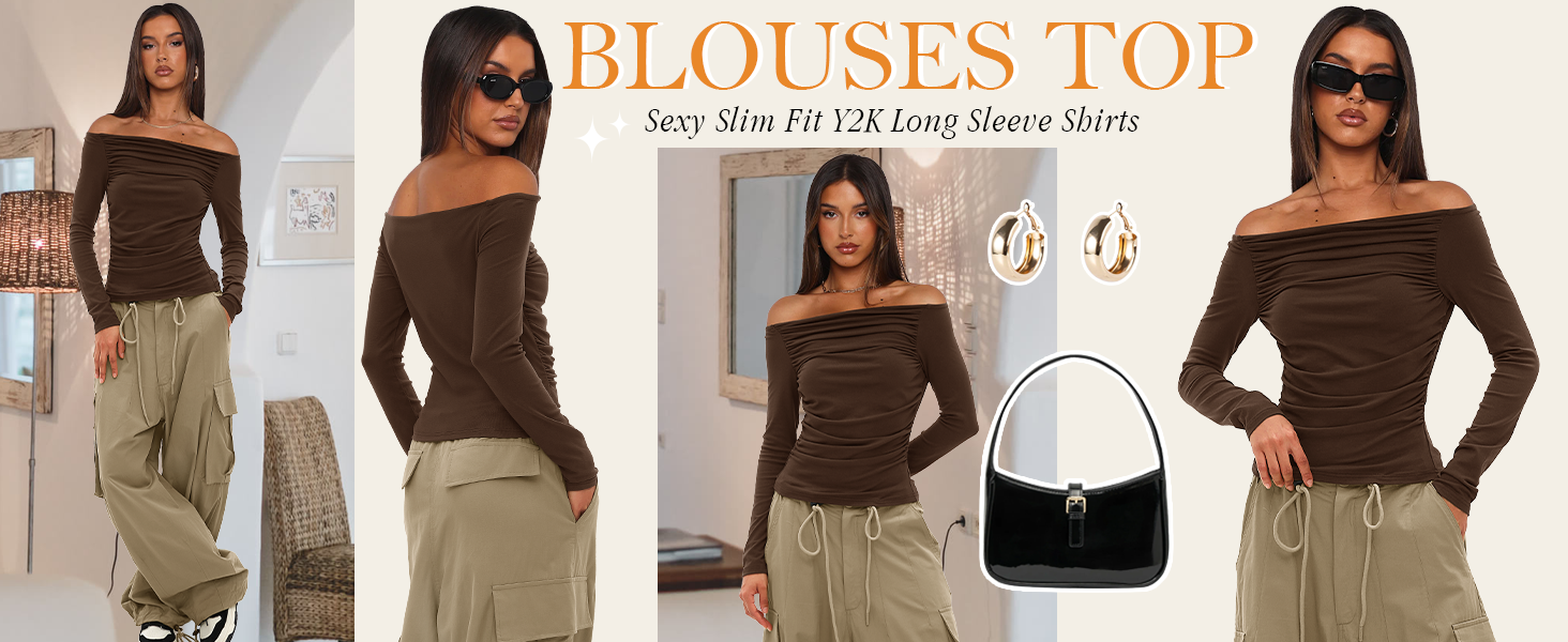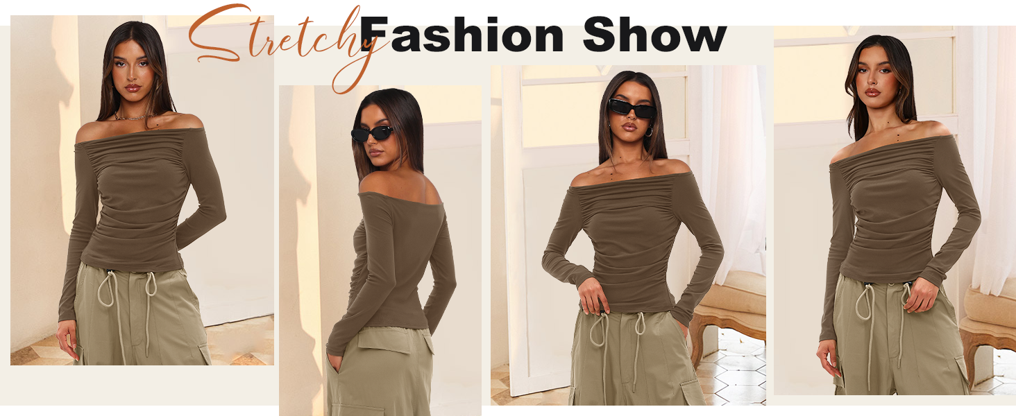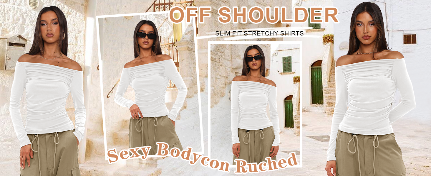 - u003Cliu003Eu003Cspan class=u0022a-list-item a-size-base a-color-baseu0022u003EMaterial Features: Made of stretchy and soft rayon fabric, our Y2K style basic tee offers a comfortable and breathable wearing experience. Our design of the slim fit crop top ensures a snug feeling without being binding.u003C/spanu003Eu003C/liu003E u003Cliu003Eu003Cspan class=u0022a-list-item a-size-base a-color-baseu0022u003EDesign Highlights: This basicu0026stylish top featuring off shoulder style and ruched design. With anti slip strips on the shoulders to allow it to stay in place. The ruched and slim fit design highlights the waistline.u003C/spanu003Eu003C/liu003E u003Cliu003Eu003Cspan class=u0022a-list-item a-size-base a-color-baseu0022u003EVersatile Styling: This basic long sleeve shirts is a must-have for spring, fall and winter. Pair the blouse with casual pants, jeans, skirts or knee-high boots and accessorize with jewelry, belts or scarves to create various looks.u003C/spanu003Eu003C/liu003E u003Cliu003Eu003Cspan class=u0022a-list-item a-size-base a-color-baseu0022u003EOccasion: This ruched top is suitable for various occasions. It can be worn casually for everyday activities or dressed up for a night out. It is perfect for those seeking a blend of trendy and versatile wardrobe options. Whether youu0027re a fashion enthusiast looking to make a statement or someone who appreciates comfort with a stylish touch, this top is a great choice.u003C/spanu003Eu003C/liu003E u003Cliu003Eu003Cspan class=u0022a-list-item a-size-base a-color-baseu0022u003EWash Instruction: This sexy solid cropped tops is suitable for machine or hand washes in cold water. Do not tumble dry or bleach.u003C/spanu003Eu003C/liu003E